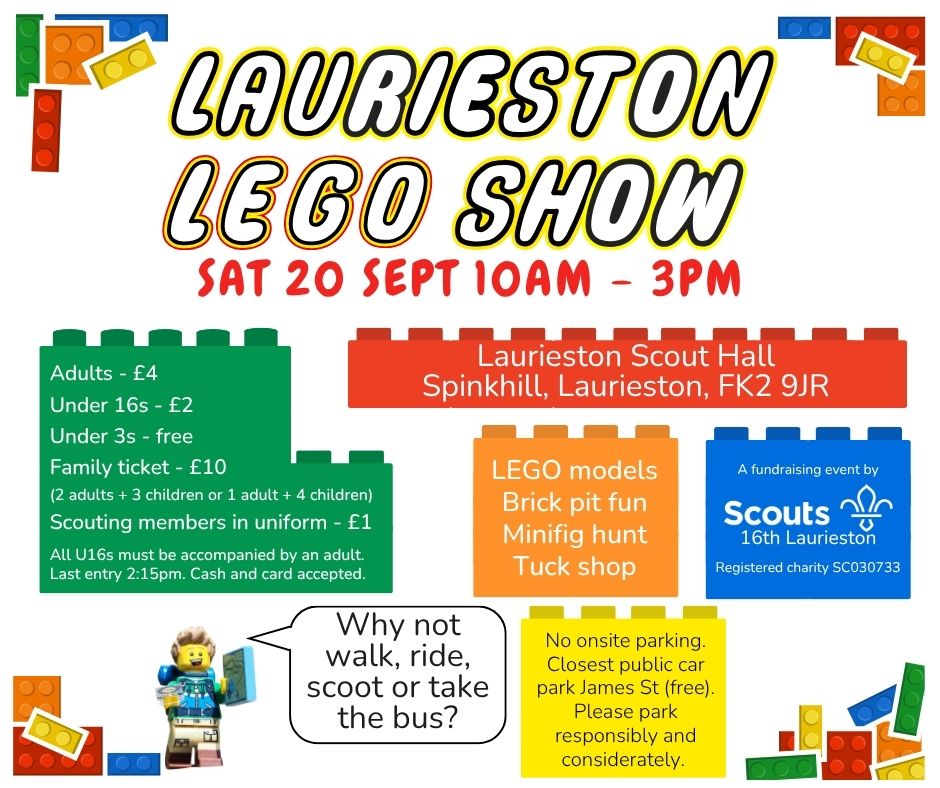 The 16th Laurieston Scout LEGO Show will be held in the Scout Hall on Saturday 20th September 2025